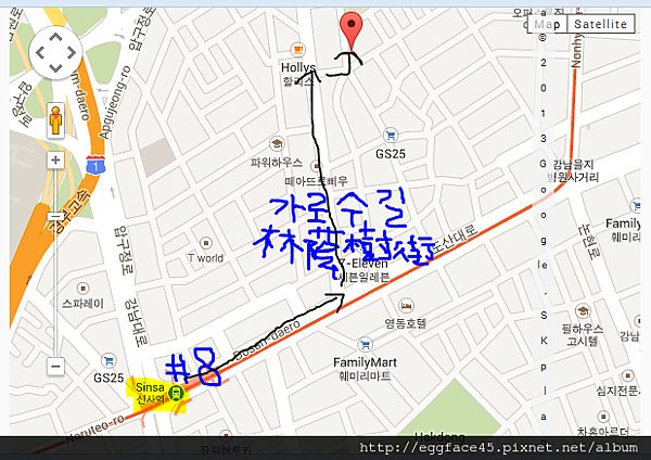 請出地鐵新沙站8號出口-->看到林蔭樹路(가로수길)左轉-->Holllys咖啡店前的巷子右轉-->第一條巷子再左轉就到了。(跟著黑色箭頭走)