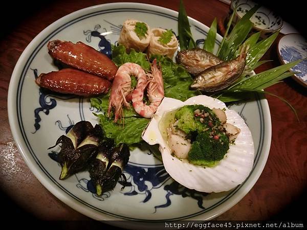 從十二點順時鐘方向依序是腐皮捲、烤魚、干貝西蘭花、茄子、烤雞翅;中間是蝦子。