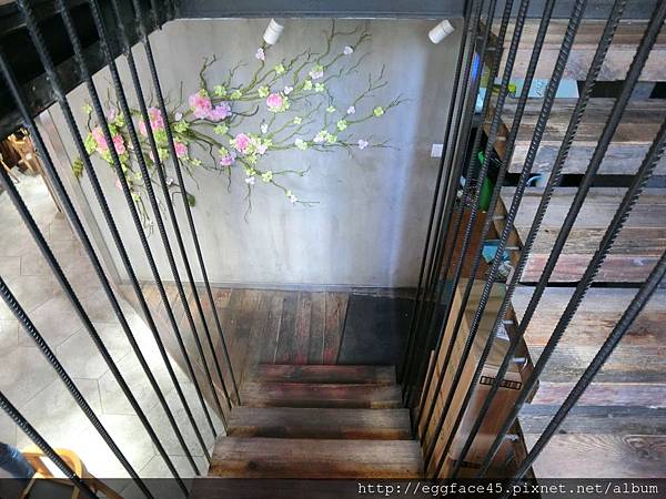水泥牆、花卉裝飾、鐵欄杆、木頭梯,