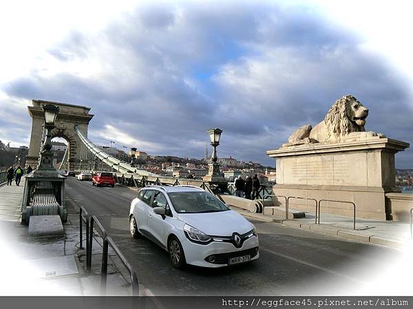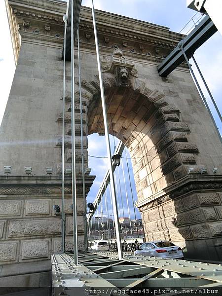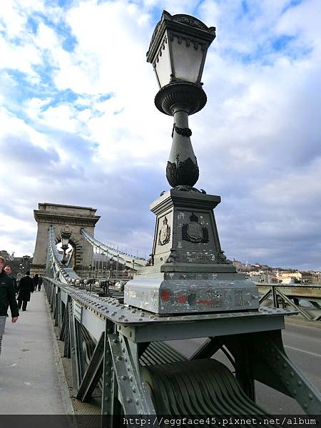 ↓巨大的石獅護衛著橋的兩側,美麗的橋柱雕刻著匈牙利國徽。