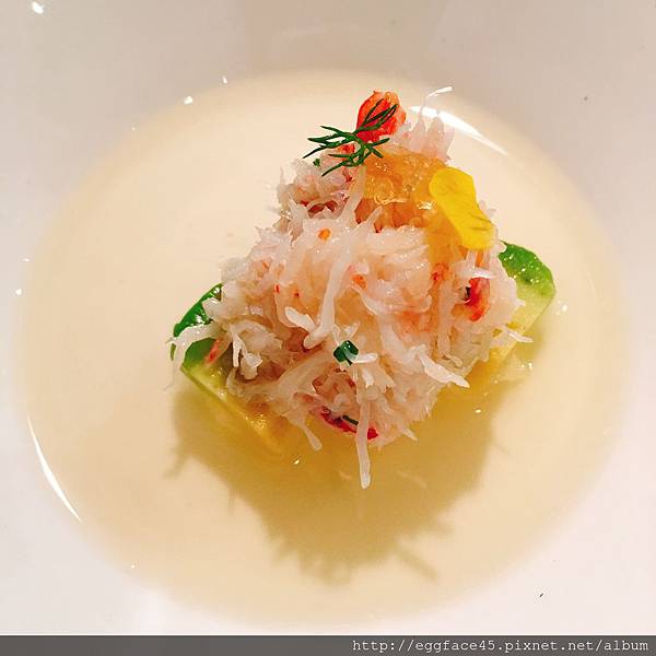 滿滿的蟹肉佐柚子醬放在醃漬黃瓜上。