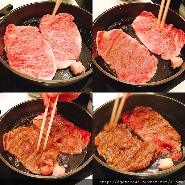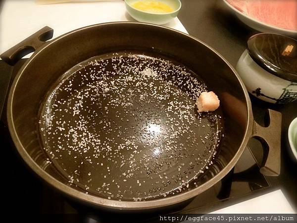 關西派的壽喜燒方式是先在熱鍋塗抹上牛油、灑上砂糖,
