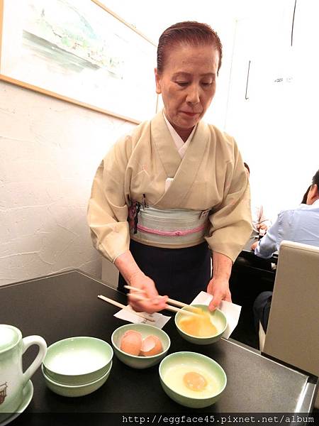 ↓媽媽桑在幫我們攪拌生雞蛋,