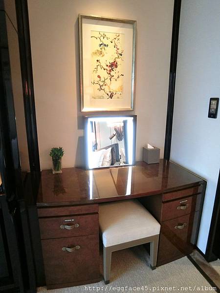 ↓梳妝台中間有個升降式、自帶光芒的化妝鏡,在這化妝、吹頭髮真的太舒服了!