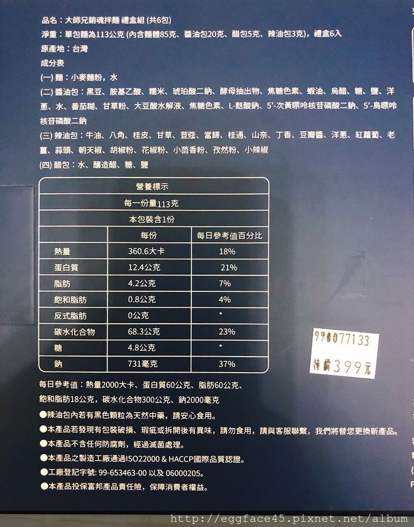 每一包的總重量為113公克(麵體85克、辣油包3克、醋包5克、醬油包20克)
