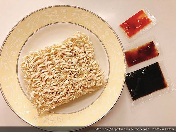 打開包裝後,拿出麵體、辣油包、醋包克、醬油包,就可以準備入鍋中煮。