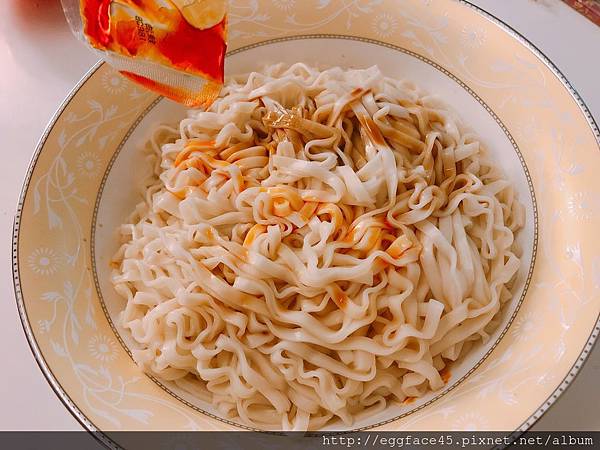 撈起麵條後,快速的倒入醬油包、醋包、辣油包,