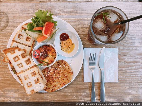 這份黃金格子吐司套餐裡含有吐司、沙拉、薯餅、烘蛋和飲品,