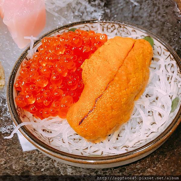 ▼兩大片的馬糞海膽和滿滿的鮭魚卵放在一起,色彩超鮮豔。