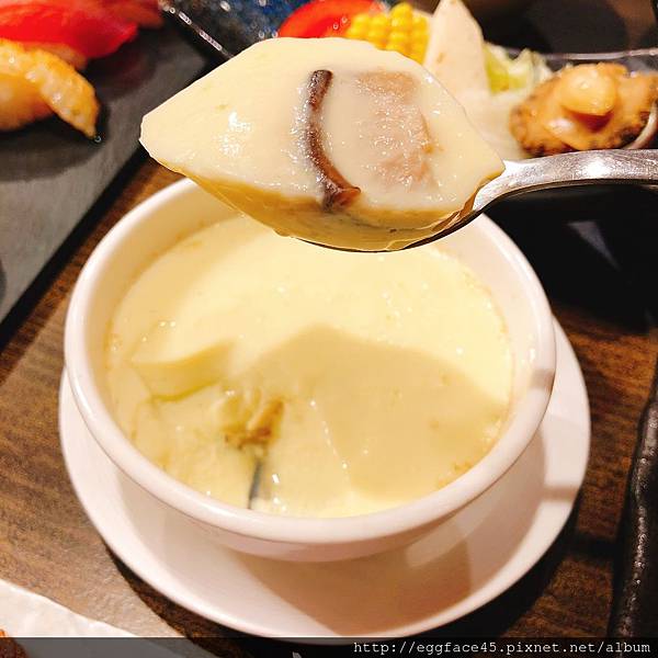 ▼茶碗蒸,裡面滿滿的海、陸配料,有雞肉、香菇、蛤蜊、蟹肉…等。