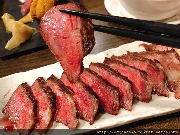 夾起一片沾點玫瑰鹽品嚐,肉汁在嘴中慢慢釋出