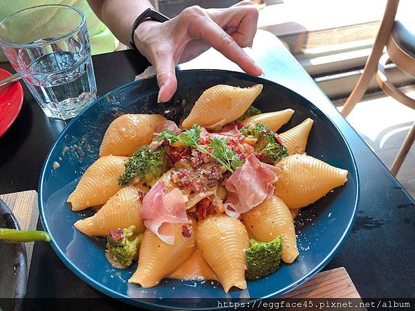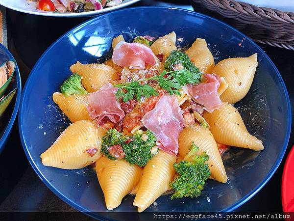 大片的帕瑪火腿、起司鋪好鋪滿在貝殼義大利麵上,