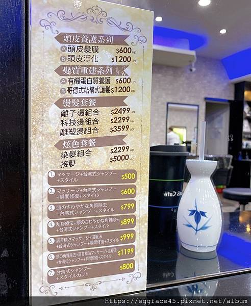 造型剪髮→燙前保養→燙髮→鉑金護髮→熱敷洗髮→造型吹整。