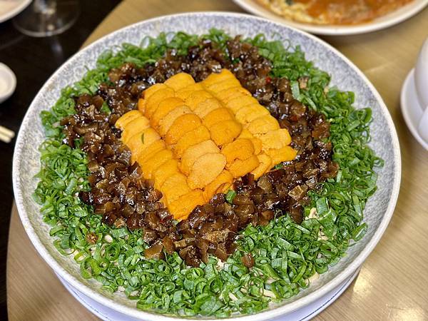整盒的海膽、滿滿的烏蔘切塊、蔥花,