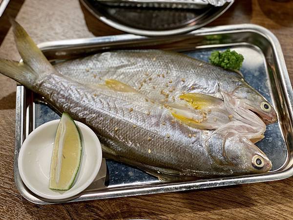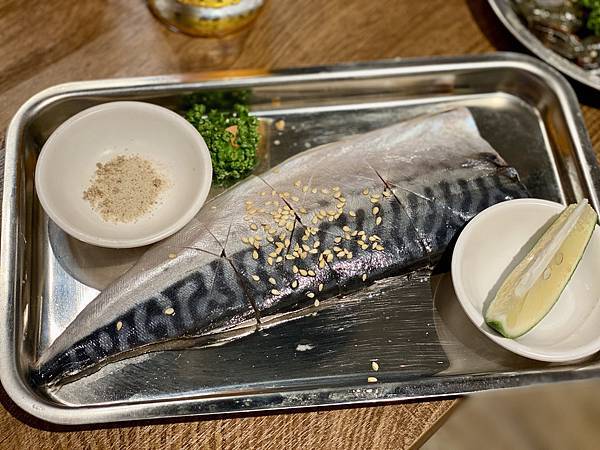 整條的鯖魚擺在盤中,看起來挺美的。