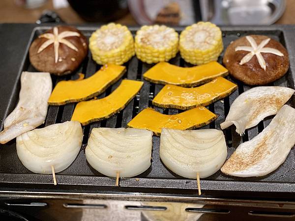這盤裡有杏鮑菇、香菇、玉米、洋蔥、南瓜,