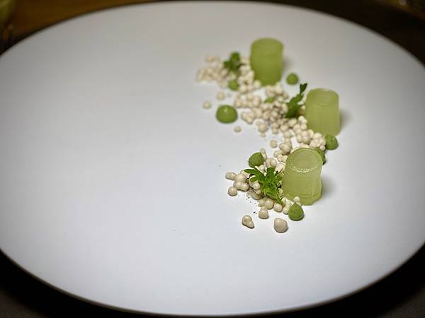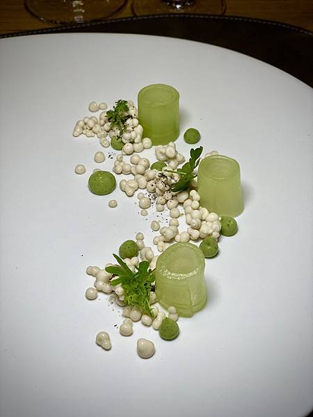 將牛奶、帕瑪森起司、生蠔打成醬汁,製成一顆顆綠色、白色石子。