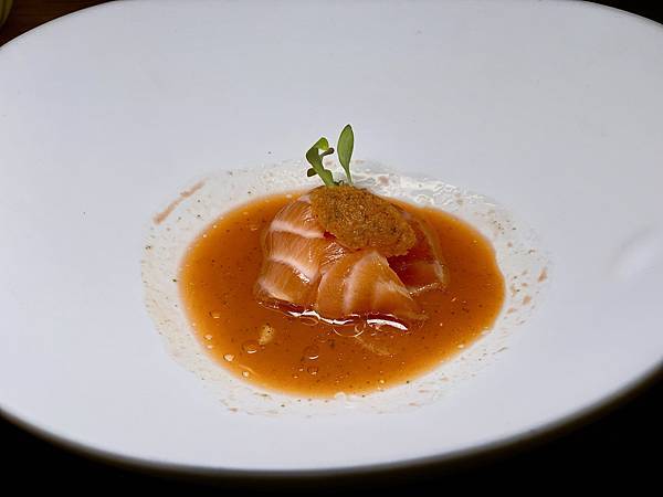 有三種層次在裡頭:胡蘿蔔泥、輕漬鮭魚、胡蘿蔔醬汁,
