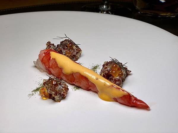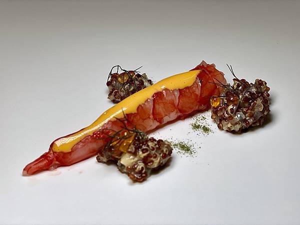 以藝術品的眼光來說菜,那這尾宜蘭胭脂蝦就有小魚游過三顆礁石的意境,