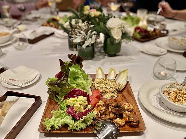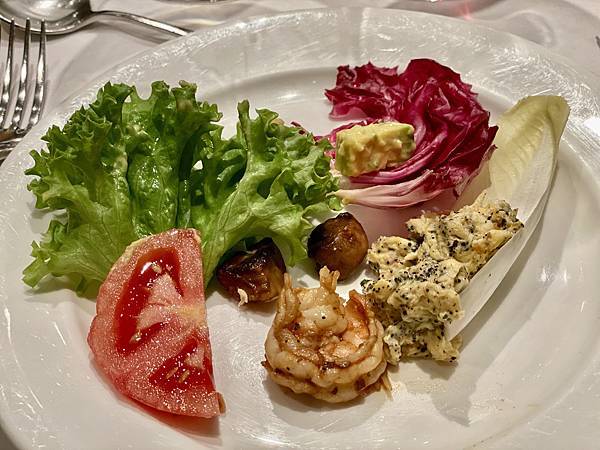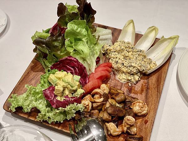 (松露醬拌土雞蛋、蘑菇炒蝦、酪梨、蘿蔓生菜)