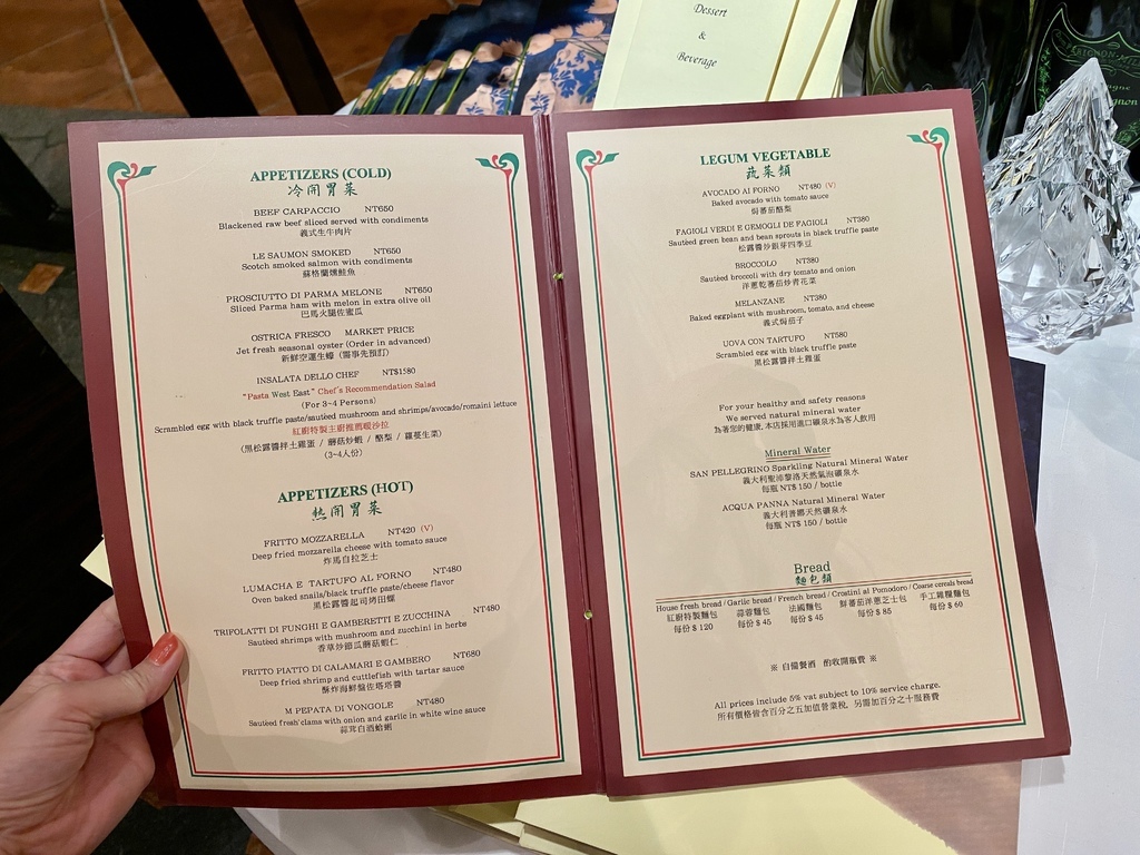 冷開胃菜、熱開胃菜、前菜、湯品、義大利麵、排餐、甜點、飲料...等,
