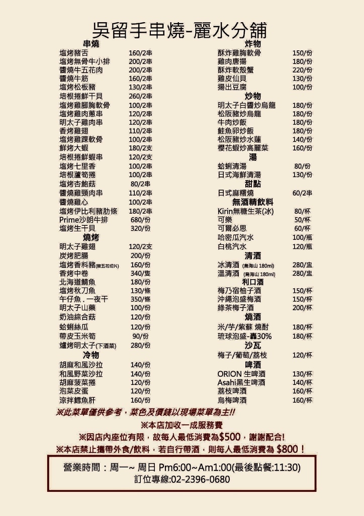 串燒、燒烤、沙拉、炸物、湯、炒物、甜點、酒、飲料皆有,