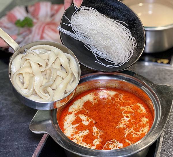 Q彈有勁的刀削麵,放入濃辛鍋煮後,