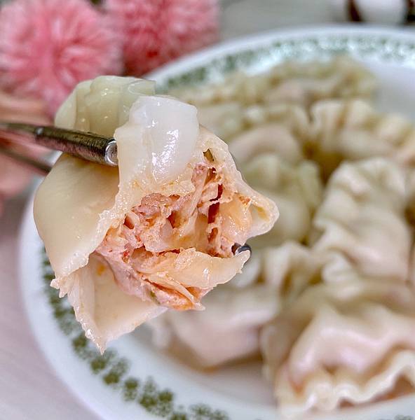 放入口中品嚐,外皮香嫩、內餡鮮甜,