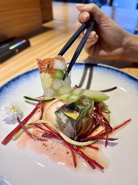 有些蔬菜藏身在晶瑩剔透的果凍裡,