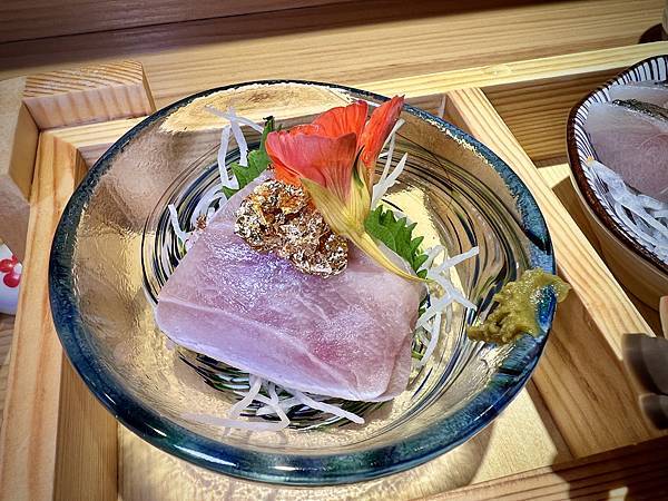 白旗魚點綴上金箔、金蓮花後,
