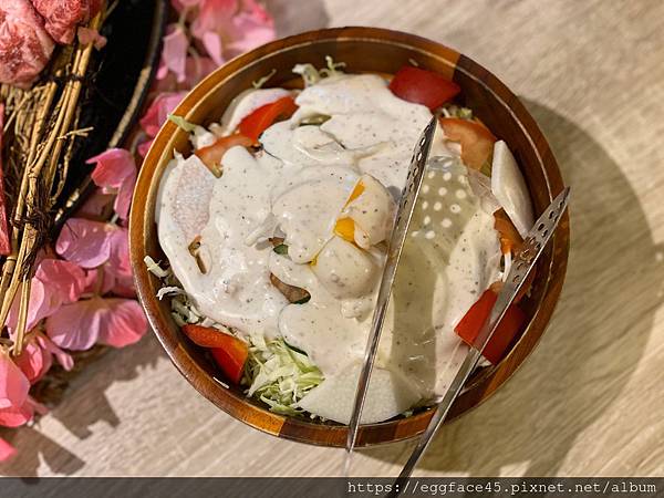 新鮮的生菜上,淋著店家使用五種堅果特製的沙拉醬,