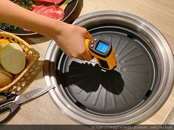 所以,店員會拿溫度計測量確認烤盤的溫度 再放入食材進行燒烤。