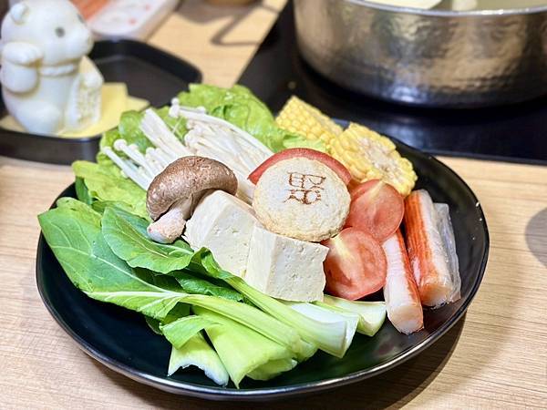 擺放多種新鮮蔬菜、火鍋料…等食材,
