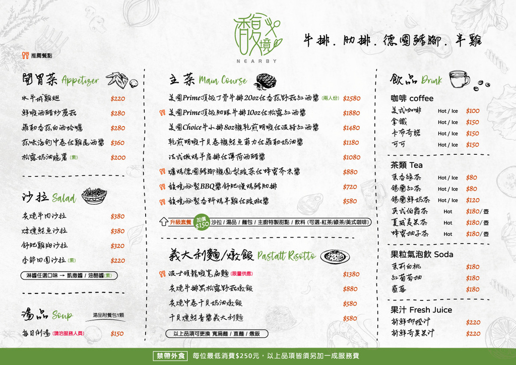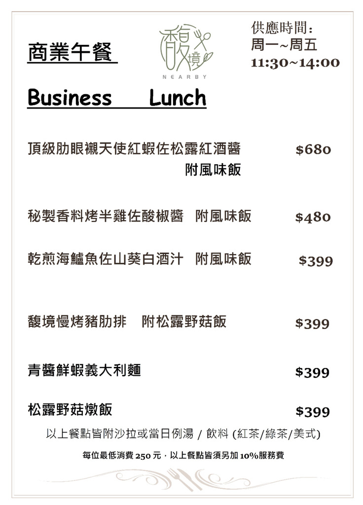 內含:沙拉、湯品、麵包、主廚特製甜點、飲料。