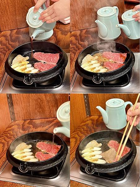 然後開始煎蔬菜、下肉、淋壽喜燒醬汁,