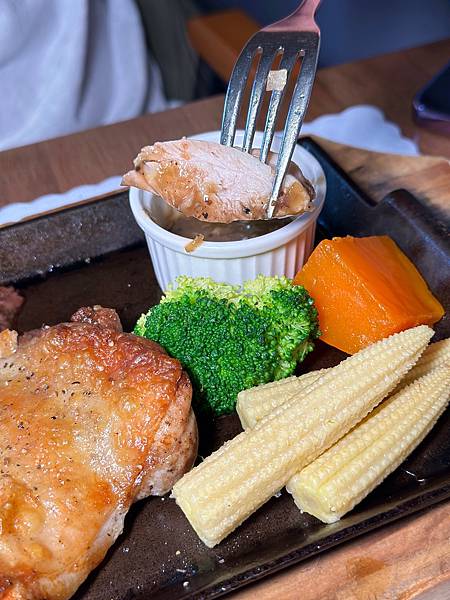 ▼迷迭香雞腿排很厚實,皮脆肉嫩的,