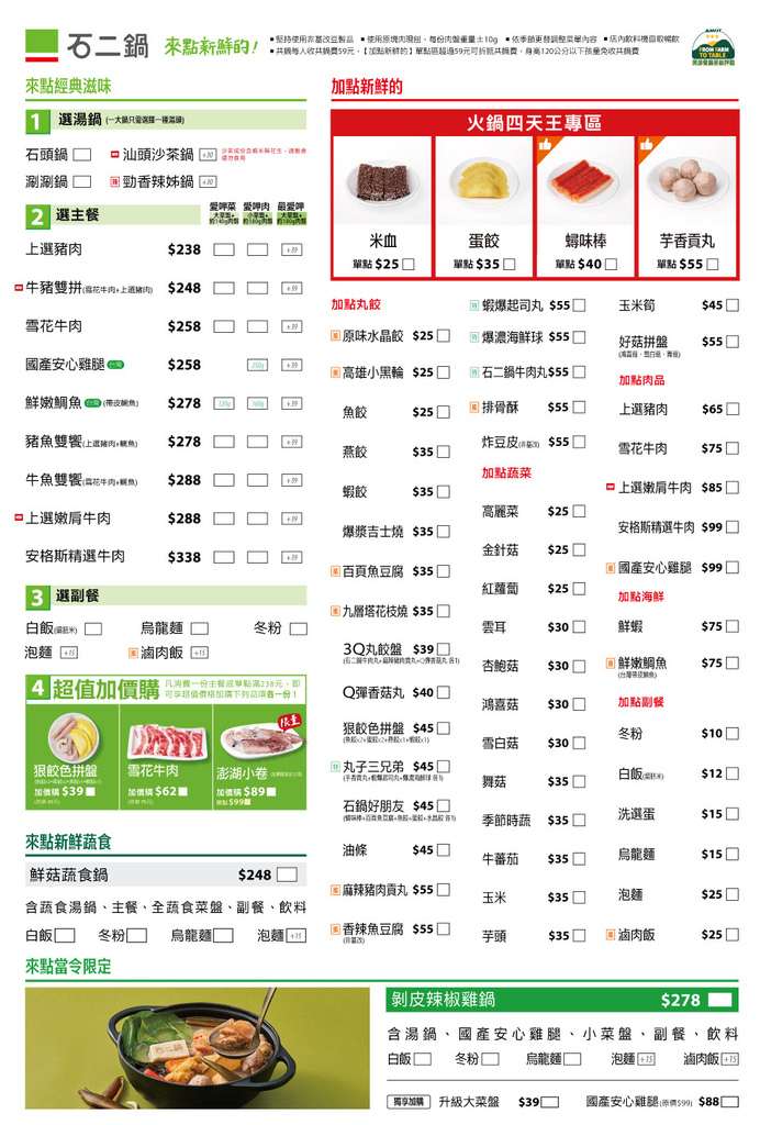 提供牛、豬、雞、海鮮…等個人鍋物,