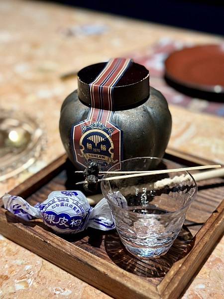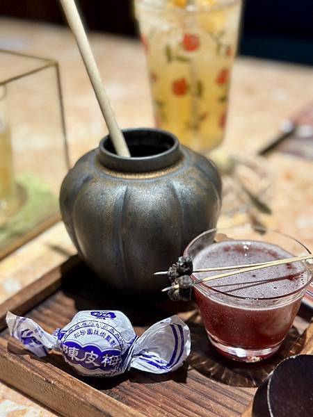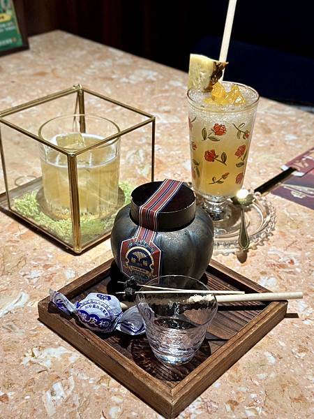 金萱桂花茶酒,基酒是vodka,出場時放在玻璃盒中,打開會冒煙,適合拍照打卡!