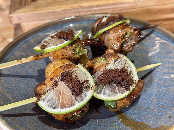 豬肉卷上頭沾著咖啡粉及檸檬糖片,