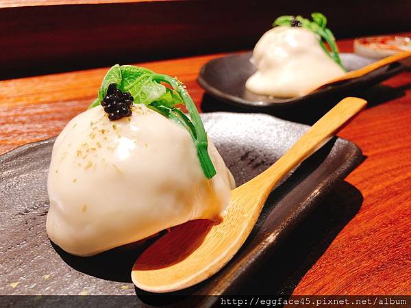 這是道顏值高的料理,雪白的醬汁裡包覆著馬鈴薯泥,上頭還點綴魚子醬,