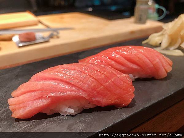 這粉嫩色的黑鮪魚中腹,顏色格外迷人,也是我的最愛,