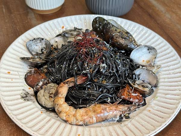 採用淡菜、蛤蜊、白蝦、花枝、自製醬汁拌炒的手工墨魚麵,