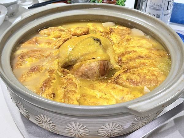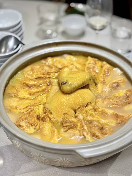 土雞慢火燉煮,湯底鋪滿新鮮的綠竹筍,使雞湯既濃郁又帶有竹筍的清甜,清爽而濃郁達到完美的平衡,圍繞著一圈的手工蛋餃外皮厚實,內餡豐富札實,蛋皮吸附著雞湯去油又入味,也豐富了雞湯的味覺。