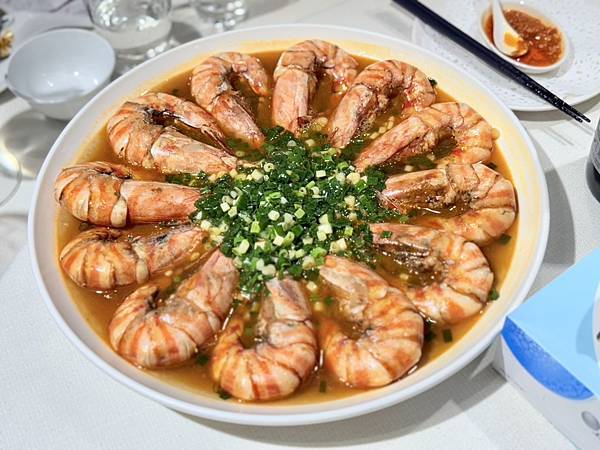 以大量蒜泥、香菜、宜蘭三星蔥、白葡萄酒和橄欖油,淋在澎湖野生明蝦上,蝦肉鮮甜香氣四溢。青蔥的香氣提升了整體風味,呈現出清爽且鮮美的口感。