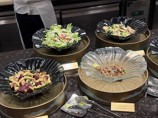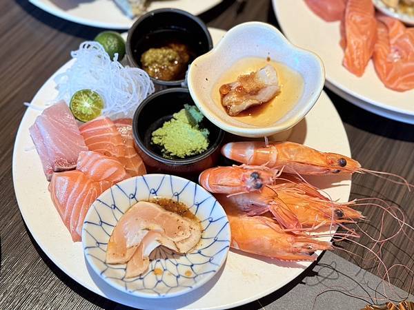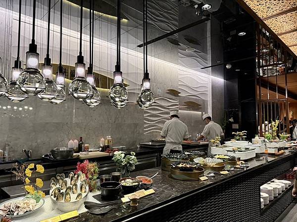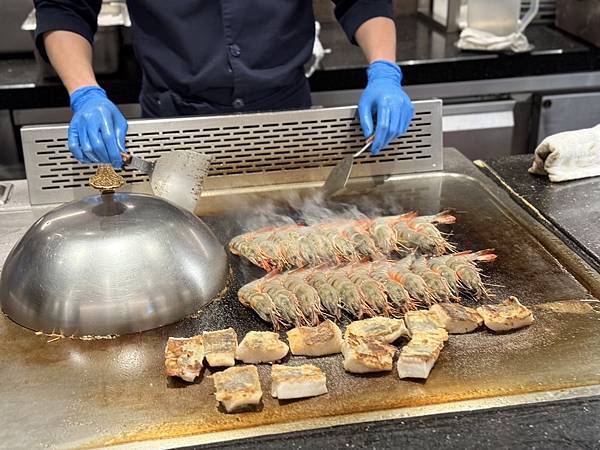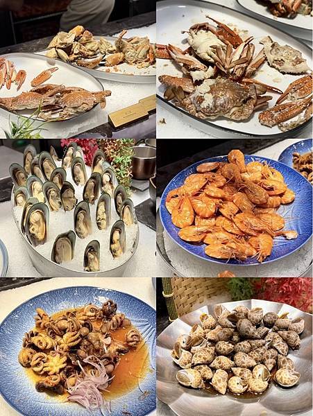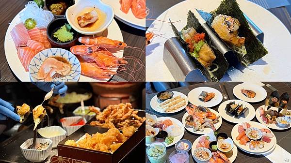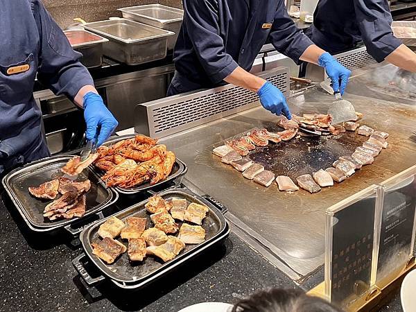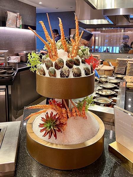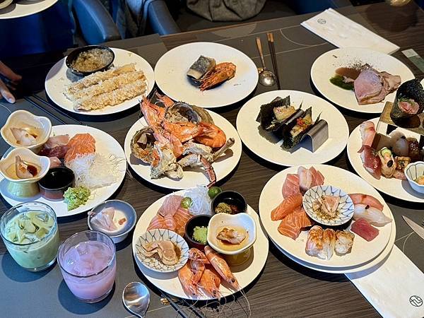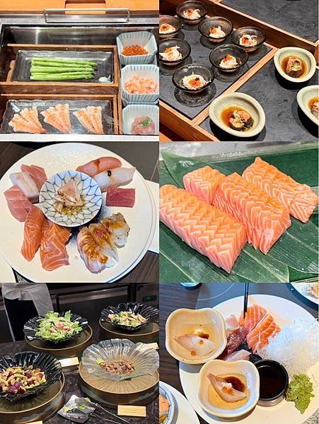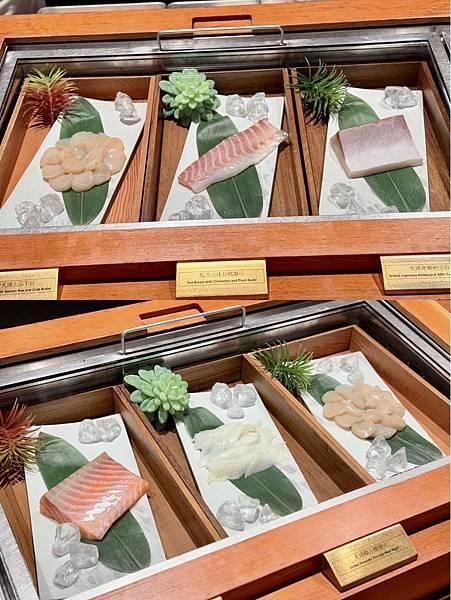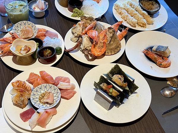 餐點選擇豐富,從新鮮生魚片、頂級壽司、現烤海鮮、現煎鐵板區、熱湯區到精緻甜點,都有專人現場服務,