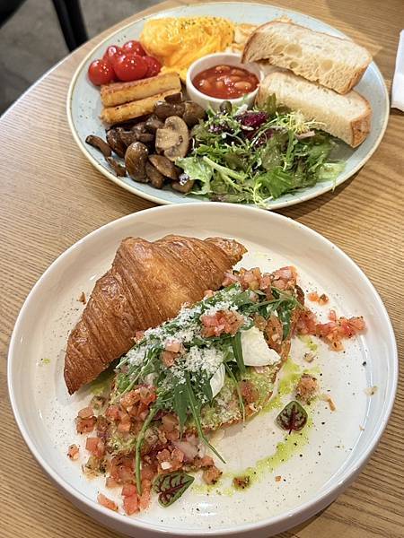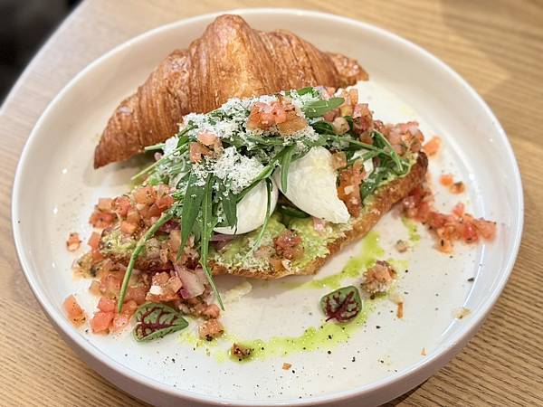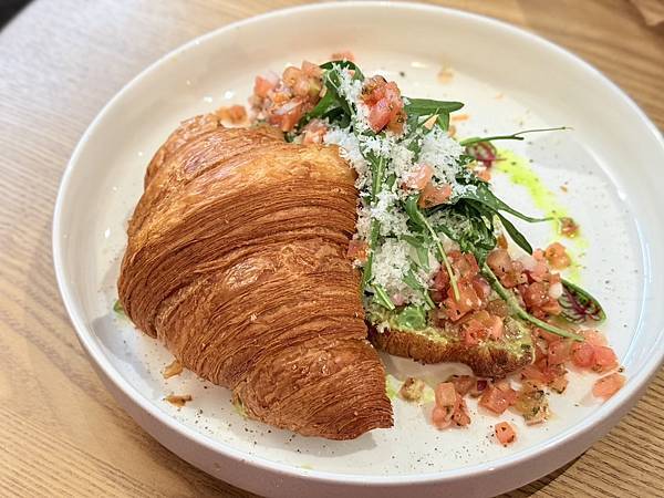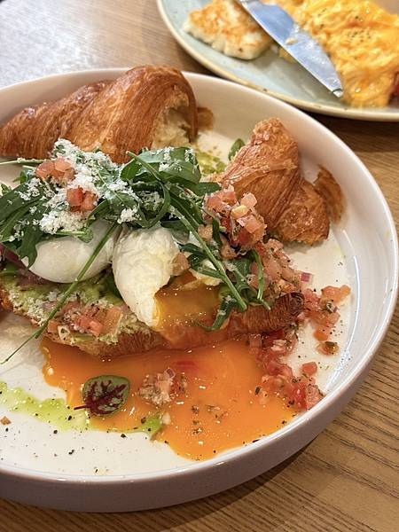 金黃色的可頌麵包,夾著濃郁的酪梨泥和嫩嫩的水波蛋,