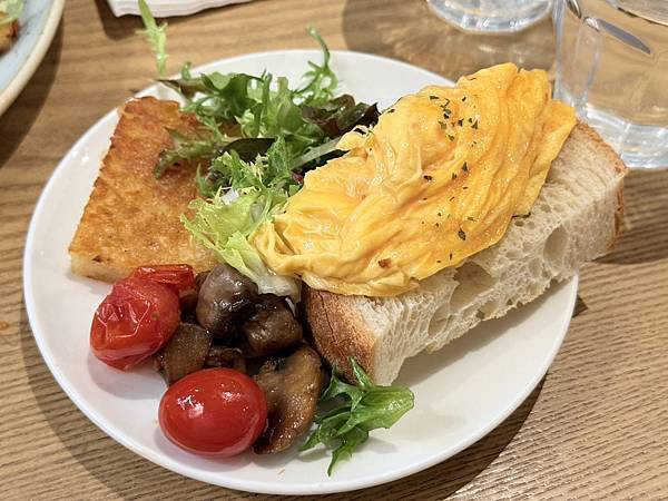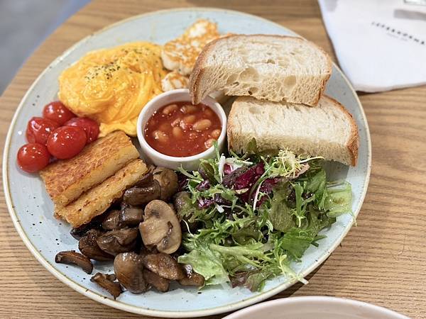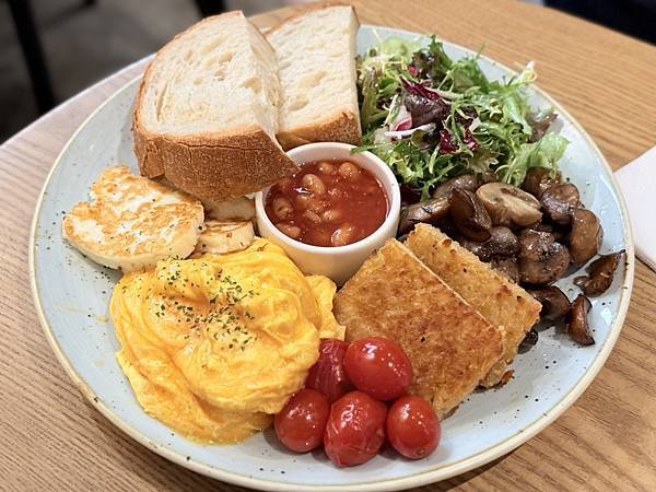 滿滿一大盤包含哈嚕米起司/嫩炒蛋/薯絲餅/炒洋菇/綜合生菜沙拉/油封櫻桃番茄/茄汁烤豆/橄欖油烤麵包,吃起來超滿足!