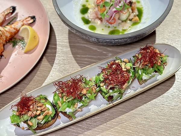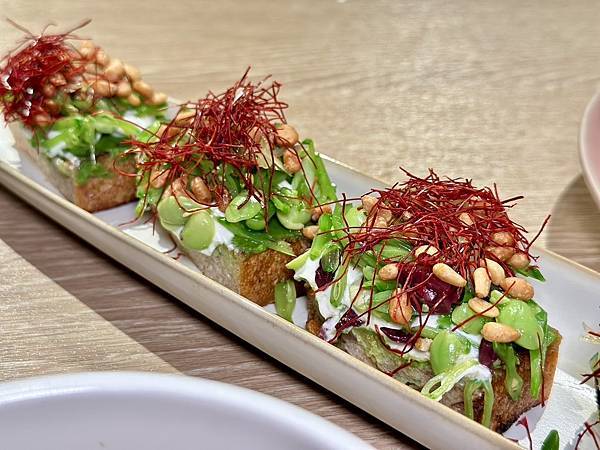 抹上青豆泥,並放上瑞可達起司、黑橄欖、松子…等食材,