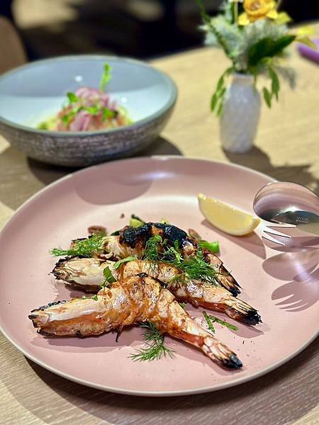 大隻的虎蝦,涮上北非突尼斯地區的哈里薩辣醬後炙烤,