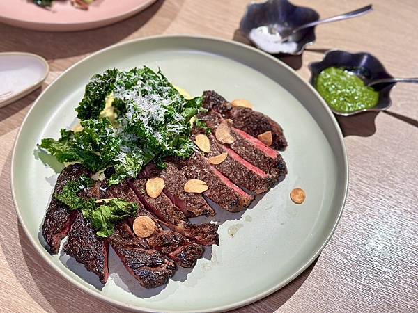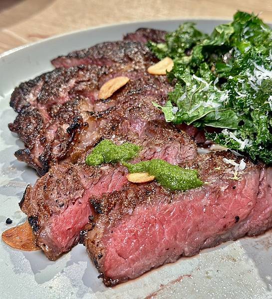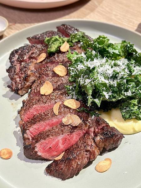 【炭烤美國頂級肋眼16 oz.、羽衣甘藍、洋芋泥、莫霍醬】